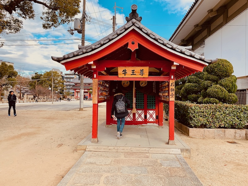 牛王尊とは、四天王寺建立の際、建築資材を運搬した牛が、伽藍が完成した途端に化けたと伝えられる「石神」で、こちらには、その言い伝えにちなみ、巨石が安置されています。