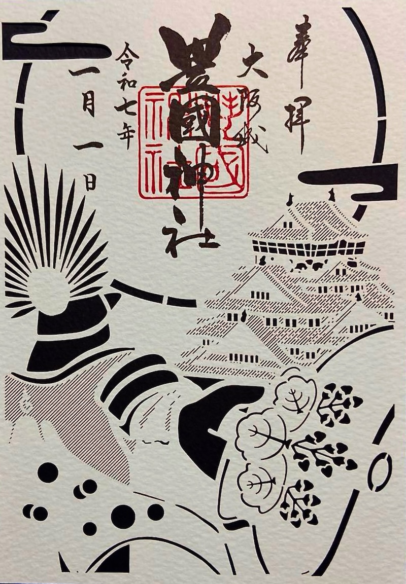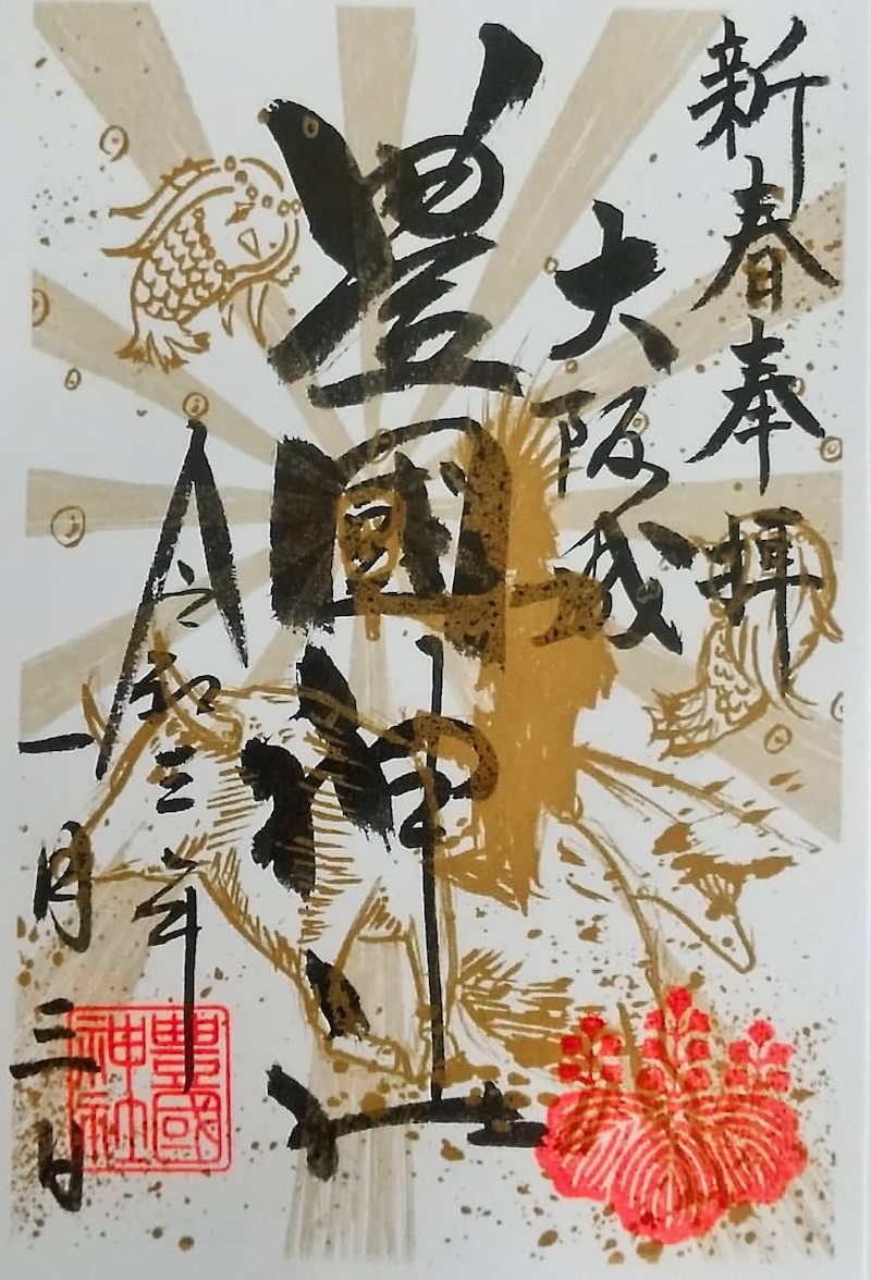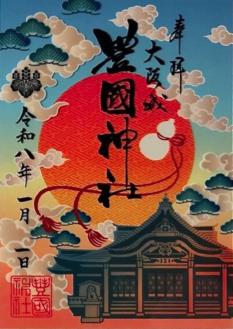 右下に豊国神社の拝殿と上部に初日の出をコンピューターグラフィック調で描いた秀麗さが光る御朱印。