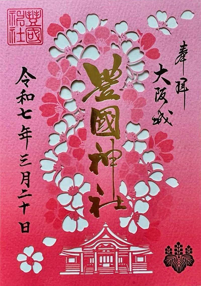 豊国神社の本殿(拝殿)を下部に、その上部に満開の桜花を数珠状に切り絵であしらった御朱印。