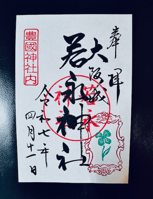 右上に「奉拝」、その左に「大阪城」、その左、御朱印中央に「豊国神社」と大きく、左端には参拝日、‥以上の墨書きがヤバぃよ素敵にあしらわれる。