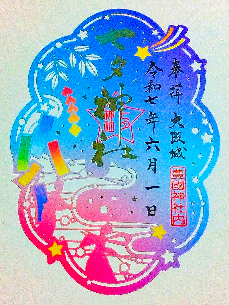 上部中央に金字で「七夕神社」と記し、あまつさえ、彦星と織姫を表現したのか、上部にブルー、下部にピンク色というグラデーションを用いた色鮮やかな見事な御朱印♡