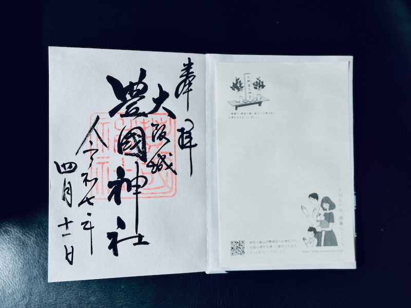 右上に「奉拝」その左に「大阪城」その左、中央に大きく「豊国神社」、そして左端に「参拝日」が墨書きで素敵に記される。