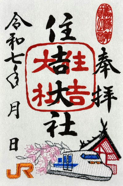 国宝の俗称・住吉造と呼ばれる建築様式で営まれた住吉大社本殿とJR新幹線700系が刺繍でクソヤバ素敵に描かれた御朱印。