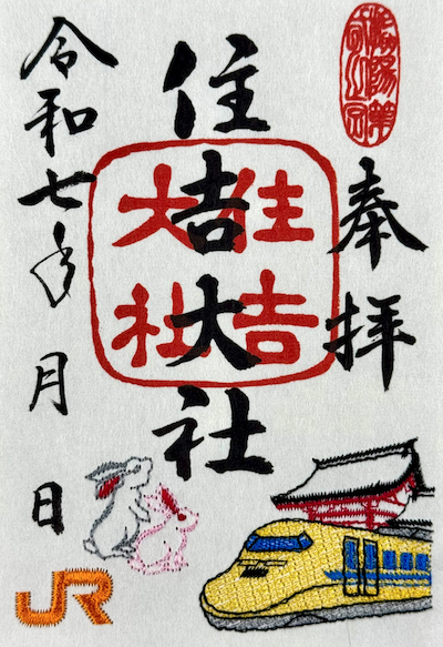 住吉大社の守護獣「住吉神兎」とドクターイエローが刺繍で描かれた御朱印。