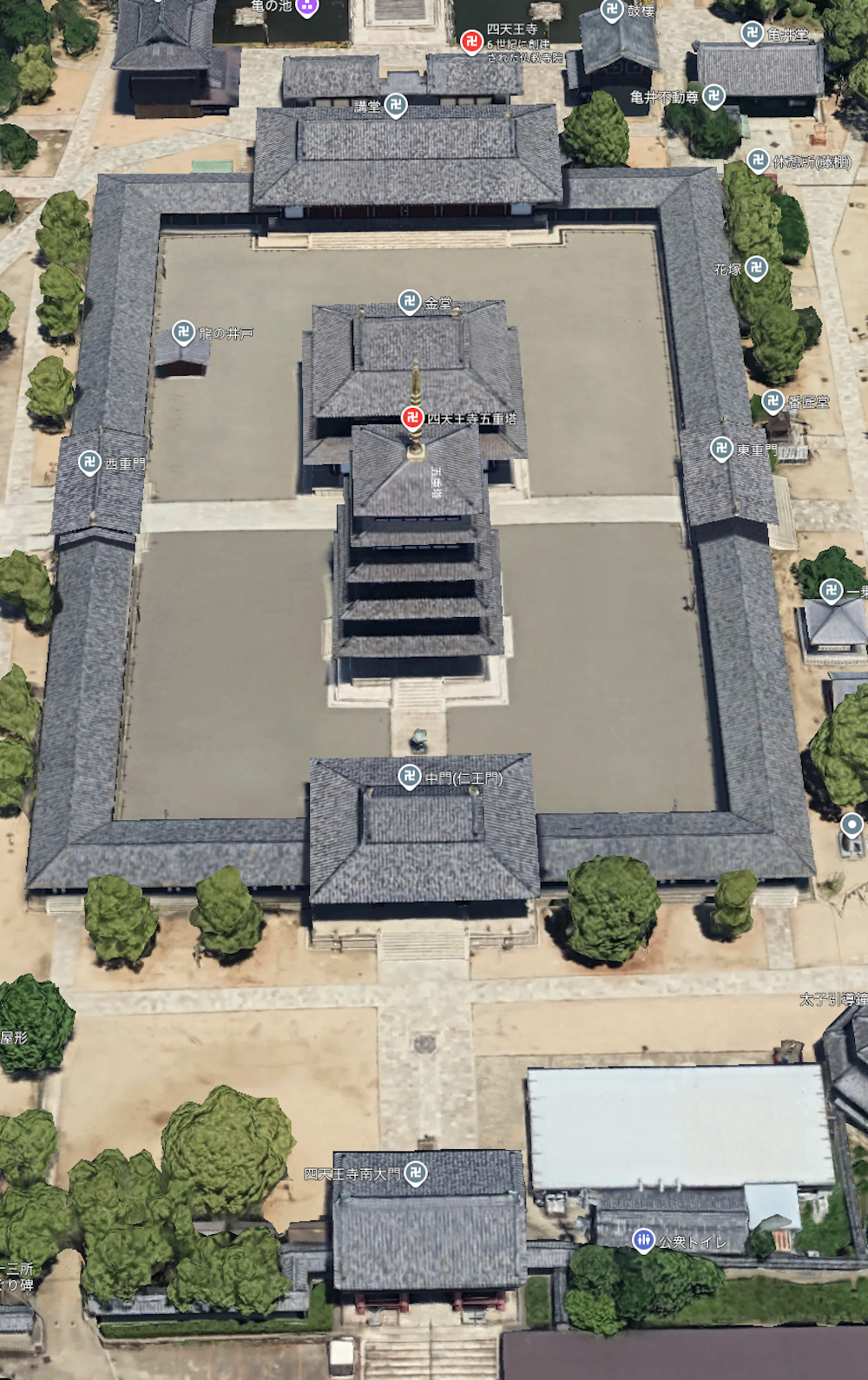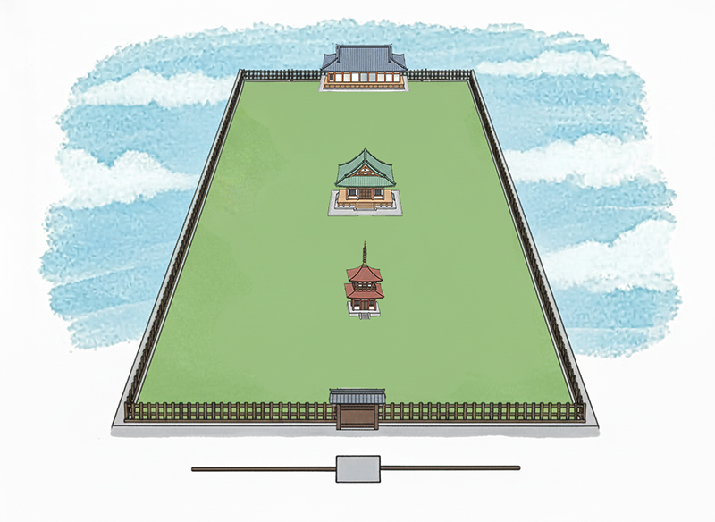 四天王寺式伽藍配置は、南側から北側に向かい、中門(仁王門)、五重塔、金堂、講堂が一直線に配され、それらを回廊が囲んでいるのが特徴。(下掲伽藍配置図のイラストを素敵に参照💘)