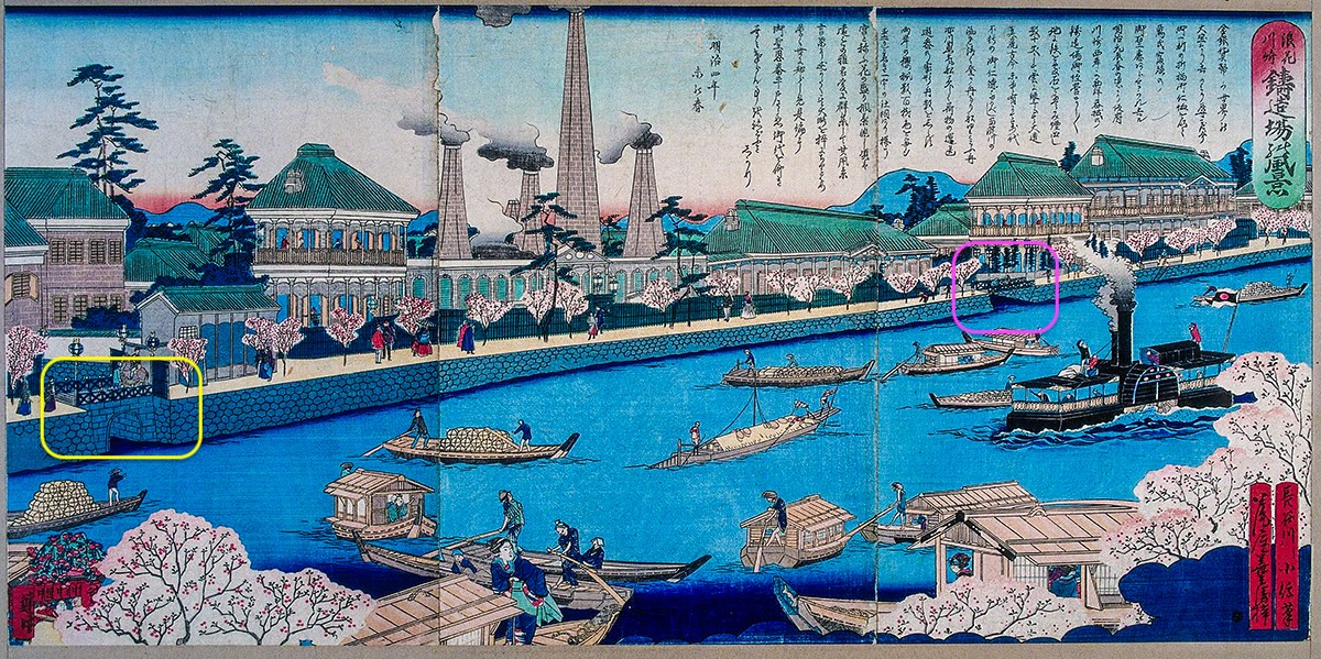 ↑1871年(明治四年)当時の造幣局を描いた錦絵。橋が二つ描かれているも、場所的に見てピンクの橋が当該、めがね橋かと思われる。