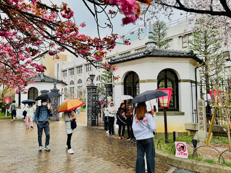造幣局の通り抜けを進んでいると洋館とその手前に金属製の透かし彫りの門柱が二本 素敵に屹立する門が出現する。